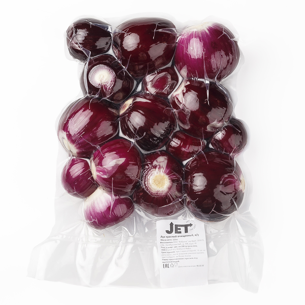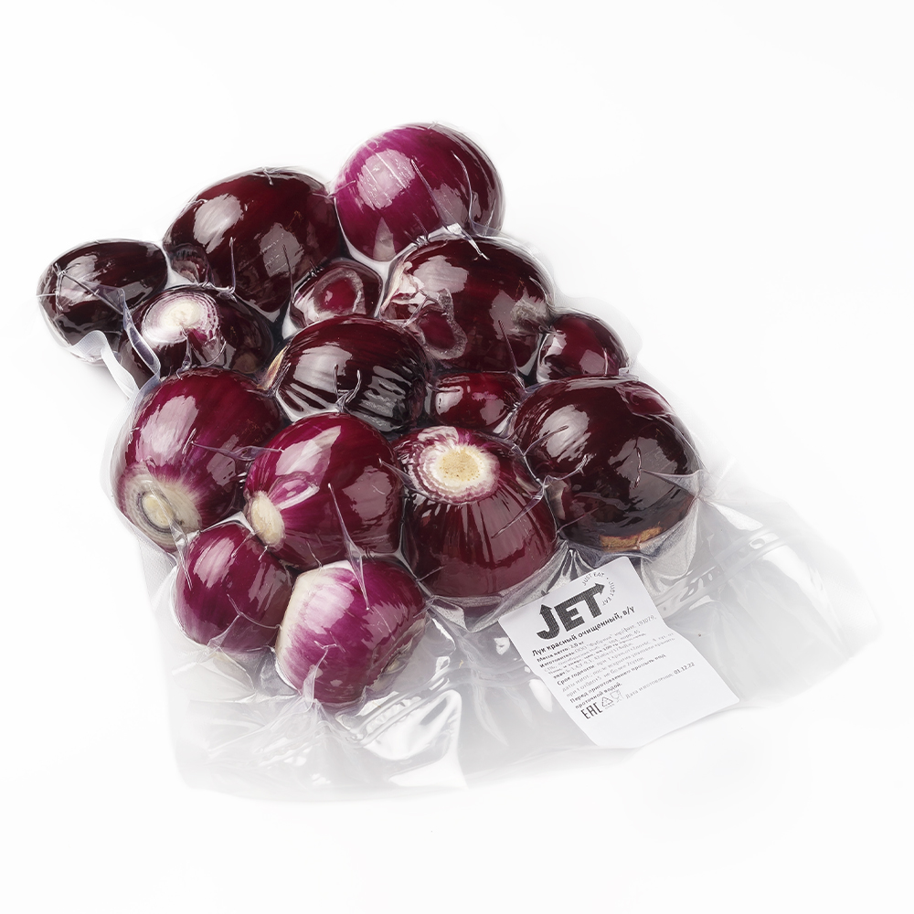 Луковицы очищенные целые, не проросшие, твердые.Цвет луковиц фиолетовый. Очищенный красный лук упакован в вакуумные пакеты по 2,0 кг.