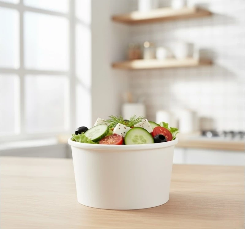 Контейнер бумажный белый для горячего, пригоден для развозки горячего супа, салатов и любых других продуктов питания. Сохраняет температуру и свежесть продуктов и супов, жироустойчив (hot Soup).Изготовлен из влагожиростойкого картона с внутренней и внешней ламинацией. Круглая форма.